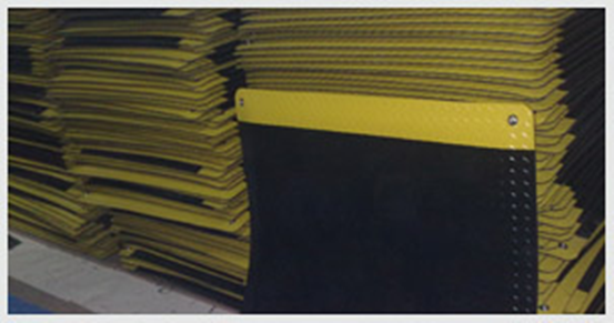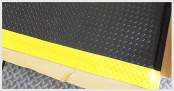 抗疲劳地垫为黑色加黄色,钢花纹表面防滑效果,可做全黑色,黄色为警示作用,可根据客户要求加上防静电标志以及防静电接地扣母扣,