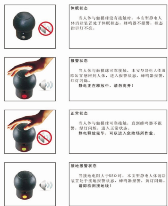 3.产品特点 1.超低功耗设计,正常使用期间无需更换电池 2.触摸式感应,无机械活动部件 3.专题环氧树脂密封,防腐、防水、防潮 4防爆触摸球,安全释放静电,人体接触不产生电击感 5.声光报警提示人体与防爆触摸球接触可靠和静电释放完毕 6接地线独立检测,接地电阻符合标准,确保可靠接地
